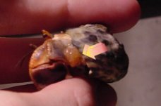 Just before the moult, the gel sack (Which is under the abdomen, inside of it's shell) will develope. The gel sack is where the hermit crab stores it's food for nutrients and energy durring the moult. Also the gel nubs (If any) will grow, and in time, start to turn darker in color. Usually this color will be orange or a brownish color. This color change indicates that the hermit crab will be moulting within the next 24 hours. Before hand, they will stock up on the needed food, water, and other nutrients needed for their upcoming event and then find a safe place to begin their task. Usually hermit crabs will dig under the sand, or under some other substrate to keep from being eaten by predators during a molt. A few like to moult above ground, but usually only when they feel safe, stressed, or when they are too weak to dig. At this time they will grow very still and after a while their dry old exoskeleton comes off, usually peeling from the back or the side of the hermit crab. After this they will be completely bare and need plenty of rest. After the exoskeleton is off, they will eat it for the added nutrients that they need to continue the process that has started, and rest while they wait for the new exoskelleton to harden.